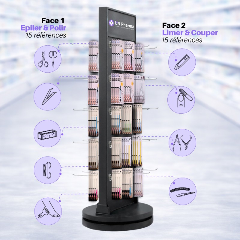 Le présentoir coutellerie 2 faces L2N Pharma est organisé selon une logique claire de gestes et d’usages, facilitant la lecture pour le patient et la vente conseil pour l’équipe officinale.